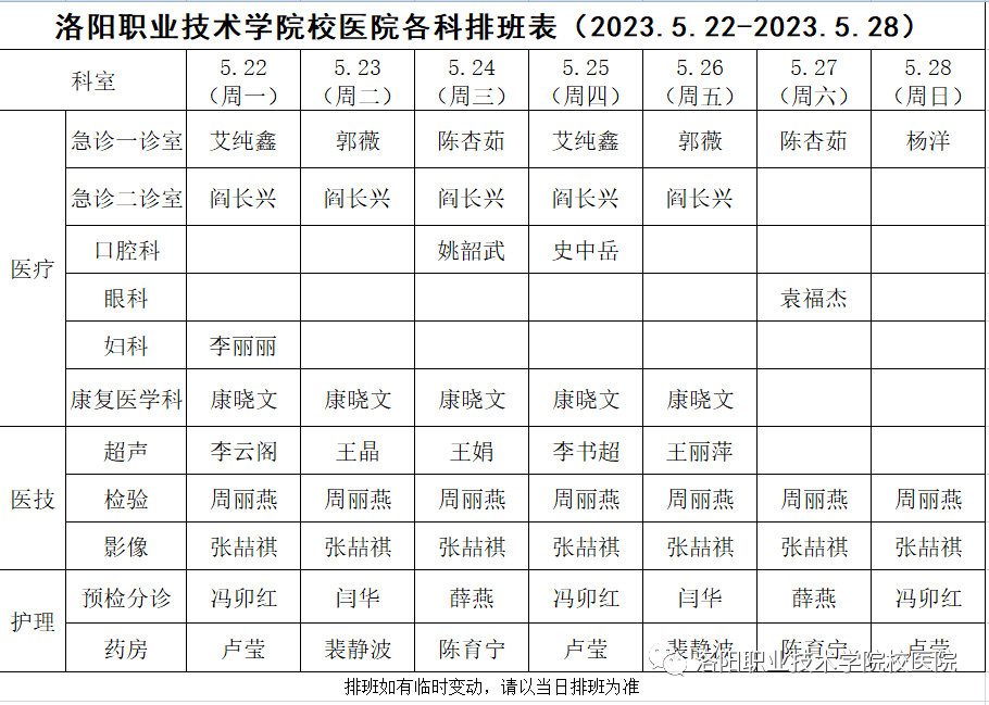 洛阳职业技术学院校医院各科排班表(2023.5.22-2023.5.28)