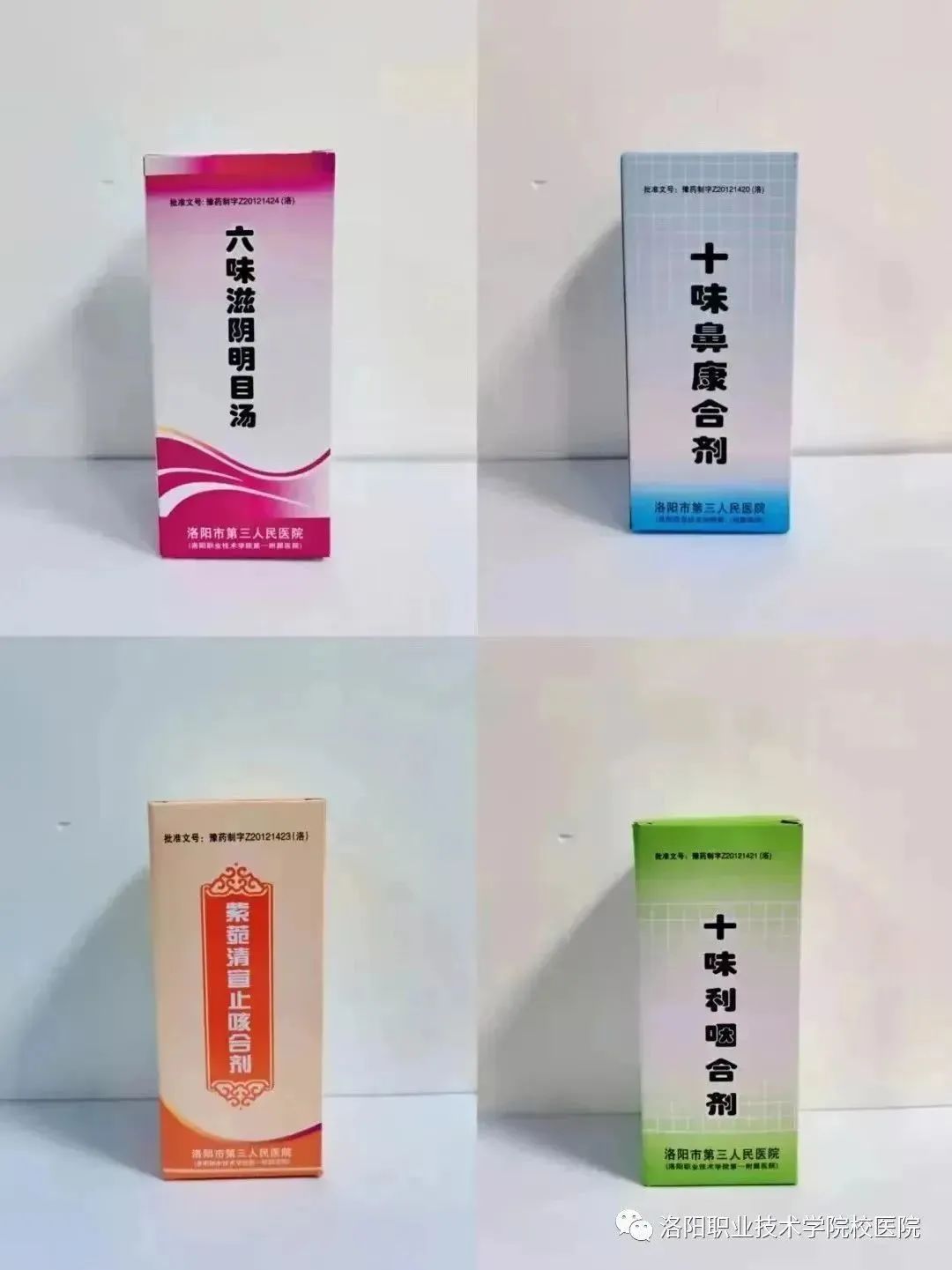 洛阳职业技术学院第一附属医院制剂室推出的十味利咽合剂、十味鼻康合剂、紫菀清宣止咳合剂、六味滋阴明目汤,十几年来获得无数患者的好评,在校医院也是师生交口称赞的良药,现就这些中药制剂的适应症进行简单说明,如需用药,请到校医院就诊后根据医生的建议服用。