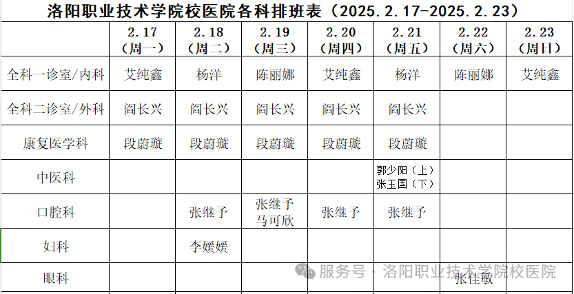 洛阳职业技术学院校医院各科排班表(2024.2.17- 2024.2.23)