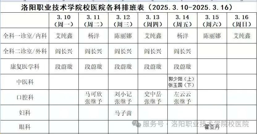 洛阳职业技术学院校医院各科排班表(2025.3.10—2025.3.16)
