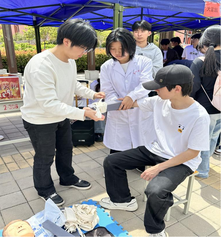 在实操演练环节,同学们分组模拟受伤场景,遵循医生和志愿者的指导,认真练习心肺复苏、加压包扎等急救技能,现场气氛热烈,大家全神贯注投入其中,积极掌握急救实操要点。
