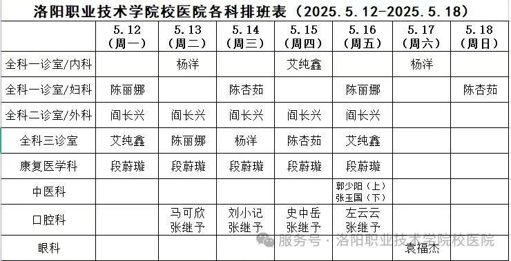 洛阳职业技术学院校医院各科排班表(2025.5.12-2025.5.18)