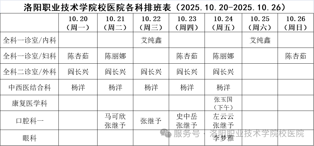 洛阳职业技术学院校医院各科排班表(2025.10.20—2025.10.26)