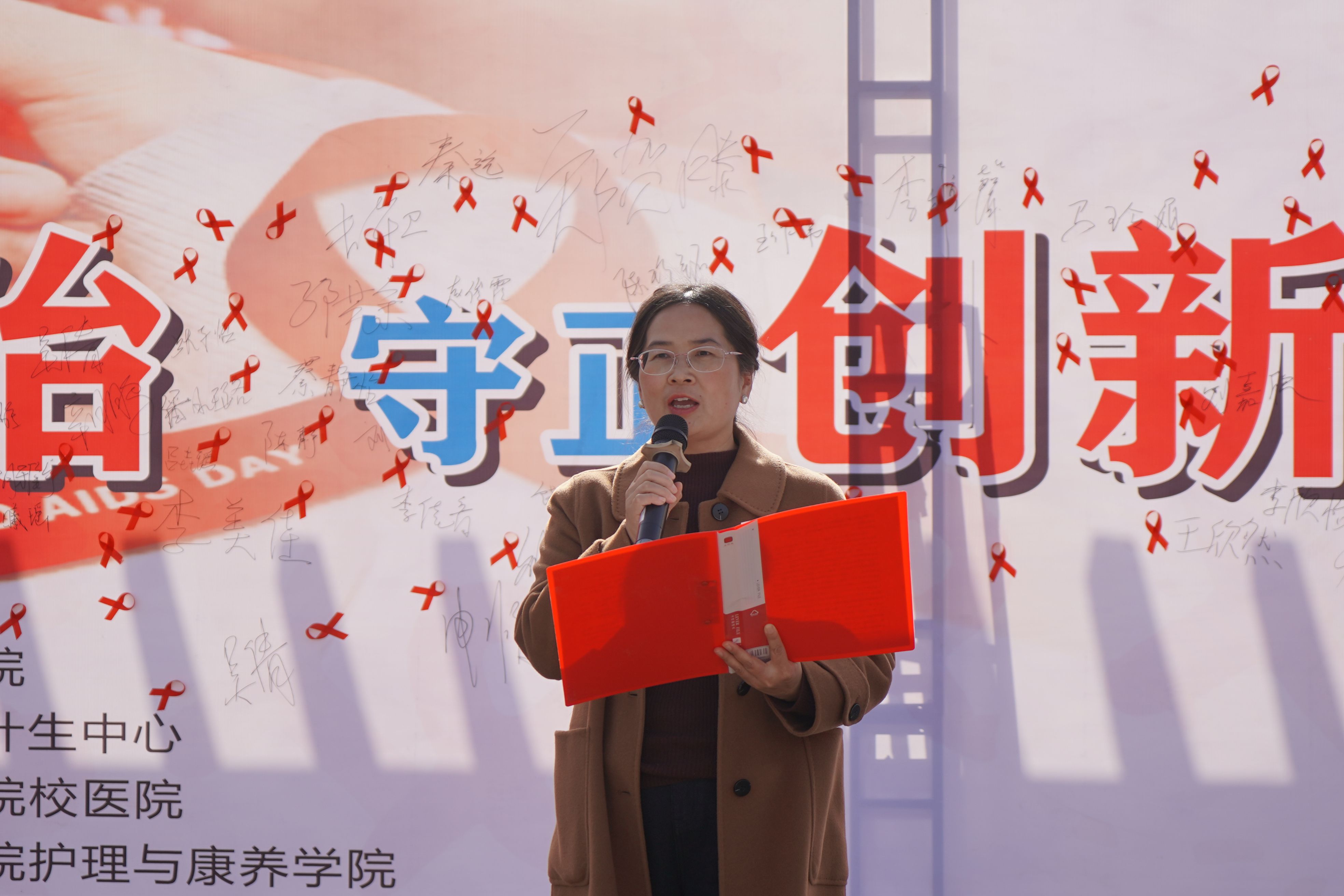 为深入推进艾滋病防治工作,营造全员参与、共担健康责任的良好校园氛围,11月27日,由校医院主办、洛阳市妇幼保健计生中心、护理与康养学院、戏曲艺术学院承办的第38个“世界艾滋病日”主题宣传周启动仪式在伊滨校区劳动广场圆满举行。启动仪式以“社会共治、守正创新、终结艾滋”为主题,通过知识普及、互动体验、文艺展演等多元形式,成功地向广大师生普及了防艾知识,吸引了数千名学子踊跃参与,让科学防艾、包容互爱成为校园新风尚。